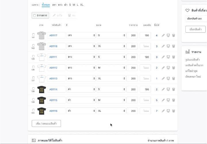 จากการเพิ่มตัวเลือกแบบในข้อ 4. ตัวสินค้าย่อยจะถูกสร้างตามตัวเลือกแบบที่กำหนด ซึ่งหากมีการสร้างตัวเลือกแบบไว้ 2 ระดับ ระบบจะทำการสร้างสินค้าย่อยออกมาตามจำนวนแบบ ตามภาพด้านล่าง