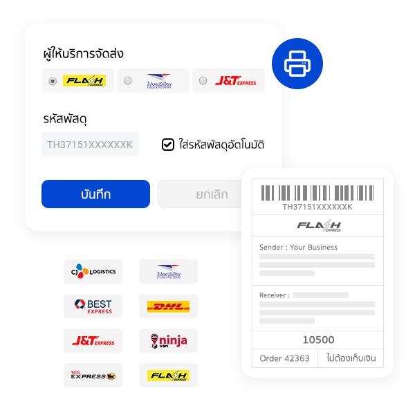 คุณสามารถออกรหัสพัสดุอัตโนมัติ ปริ๊นใบปะหน้ากล่องพัสดุ ใบเสร็จรับเงิน รวมถึงเรียกขนส่งมารับตามช่วงเวลา ครบทุกขั้นตอนการจัดส่งที่ธุรกิจต้องการ