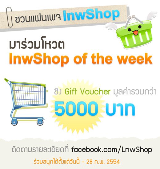 - ผู้ร่วมโหวต >> ทีมงานจะสุ่มแจกรางวัล Gift Vouchers มูลค่า 200 บาท จำนวนสัปดาห์ละ 5 รางวัล เพื่อใช้ซื้อสินค้าภายในร้านที่ได้รับรางวัล LnwShop of the week